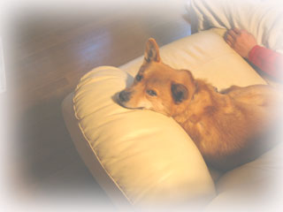 写真左:庭で飛び回るコモ 写真右:くつろぐコモ