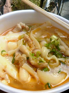 少し独特の香りがするピリ辛あっさりスープの中に削った麺が